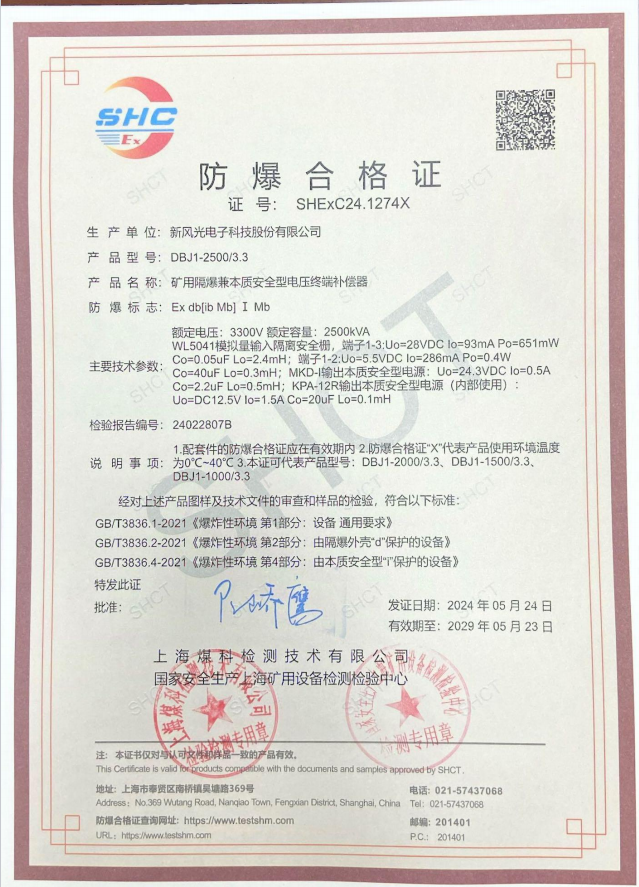 该产品陆续完成现场评审、产品技术审核、矿用产品安全标志送样性能检验等有关认证的各项申请办理工作,经检测机构确认,“矿用隔爆兼本质安全型电压终端补偿器”符合矿用产品相关标准及技术条件,具备卓越的隔爆和本质安全特性,顺利通过煤安认证和防爆认证。